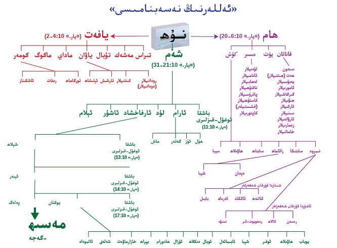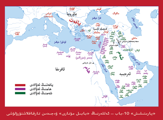 □10:1 «ئىزاھات» ــ مۇشۇ بابتىكى نەسەبنامىدىكى بەزى تەپسىلاتلار ۋە نەسەبنامىدىكى يەتمىش ئەلنىڭ ھازىرقى قايسى ئەل ئىكەنلىكى توغرۇلۇق «قوشۇمچە سۆز»ىمىزنى، شۇنداقلا مۇناسىۋەتلىك خەرىتىنى كۆرۈڭ. «تۆۋەندىكىلەر نۇھنىڭ ئوغۇللىرىنىڭ ئەۋلادلىرىدۇر: ــ » ــ مۇشۇ جۈملە بىلەن «ئالەمنىڭ يارىتىلىشى»نىڭ تۆتىنچى «تولىدوت»ى («تارىخى»)، يەنى «نۇھنىڭ ئوغۇللىرىنىڭ تولىدوتى» («نۇھنىڭ ئوغۇللىرىنىڭ ئەۋلادلىرىنىڭ تارىخى») (1:10-9:11) باشلىنىدۇ.