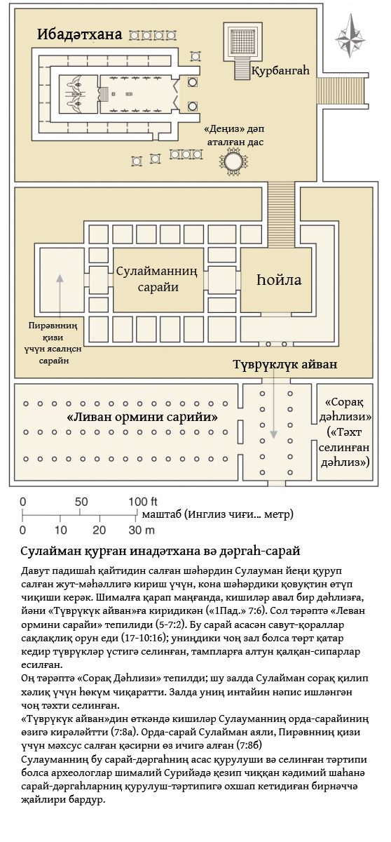 У узунлуғини әллик гәз, тоғрисини оттуз гәз қилип, түврүклүк бир дәһлиз ясиди; униң алдида йәнә бир дәһлиз бар еди, вә униң алдида йәнә түврүклүк айван бар еди. «униң алдида йәнә бир дәһлиз бар еди, вә униң алдида йәнә түврүклүк айван бар еди» — бу айәтниң иккинчи қисмидики ибранийчә ибариләр интайин аз учрайдиған болғачқа, мәнасини пәқәт пәрәз қилғили болиду. «...униң алдида йәнә түврүклүк айван бар еди» дегәнниң башқа бир хил тәрҗимиси «...униң алдида йәнә түврүкләр вә пәләмпәй бар еди».