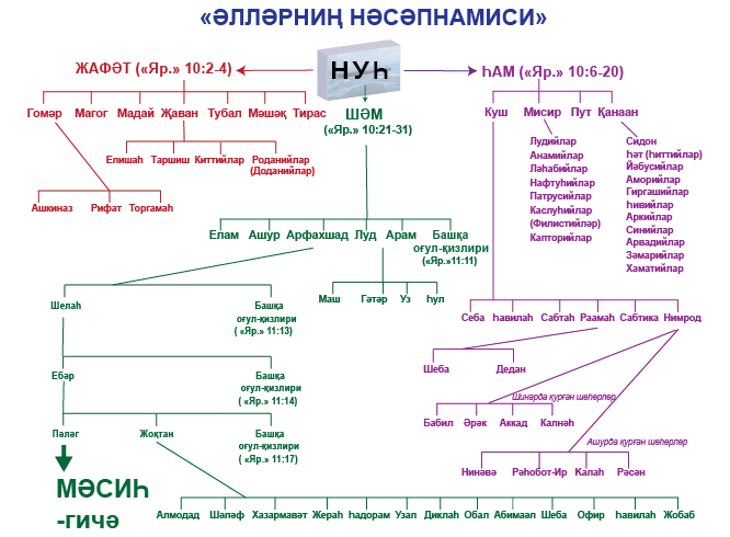 □10:1 «изаһат» — мошу бабтики нәсәбнамидики бәзи тәпсилатлар вә нәсәбнамидики йәтмиш әлниң һазирқи қайси әл екәнлиги тоғрилиқ «қошумчә сөз»имизни, шундақла мунасивәтлик хәритини көрүң. «Төвәндикиләр Нуһниң оғуллириниң әвлатлиридур: — » — мошу җүмлә билән «Аләмниң Яритилиши»ниң төртинчи «толидот»и («тарихи»), йәни «Нуһниң оғуллириниң толидоти» («Нуһниң оғуллириниң әвлатлириниң тарихи») (10:1-11:9) башлиниду.