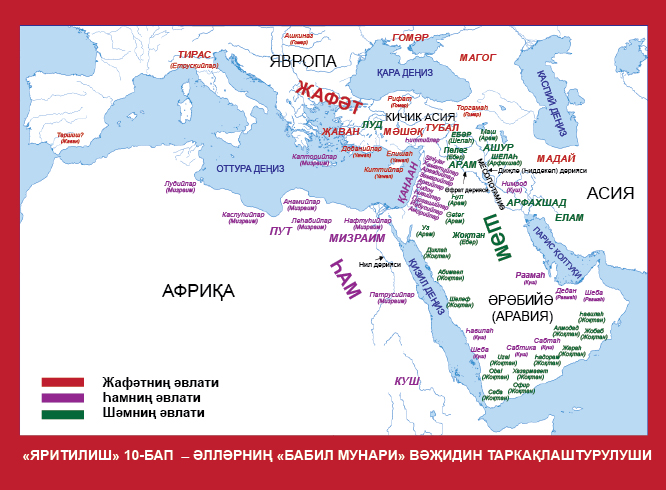 □10:10 «Шинар» — «Бабил» яки «Бабилон»ниң башқа бир намидур. «айәтниң башқа хил тәрҗимиси» — «униң падишалиғиниң асаси Шинар зиминидики Бабил, Әрәк, Аккад вә Калнәһ дегән шәһәрләр еди».