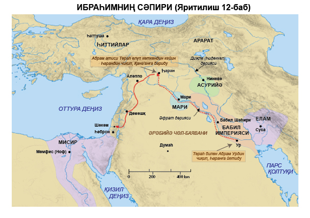 Сән өз жутуңдин, өз уруқ-туққанлириңдин вә өз ата җәмәтиңдин айрилип, Мән саңа көрситидиған зиминға барғин. Рос. 7:3; Ибр. 11:8. Шундақ қилсаң Мән сени улуқ бир хәлиқ қилип, саңа бәхит-бәрикәт ата қилип, намиңни улуқ қилимән; шуниң билән сән өзүң башқиларға бәхит-бәрикәт болисән; кимләр саңа бәхит-бәрикәт тилисә Мән уларни бәрикәтләймән, кимки сени хорлиса, Мән чоқум уни ләнәткә қалдуримән; сән арқилиқ йәр йүзидики барлиқ аилә-қәбилиләргә бәхит-бәрикәт ата қилиниду! — деди. «сени хорлиса» — яки «сени төвән көрсә», «сени пәс қилса». «сән арқилиқ йәр йүзидики барлиқ аилә-қәбилиләргә бәхит-бәрикәт ата қилиниду!» — Худаниң бу интайин муһим әһдиси вә шәртлири тоғрилиқ «қошумчә сөз»имиздә азрақ тохтилимиз.   Яр. 18:18; 22:18; 26:4; Рос. 3:25; Гал. 3:8.