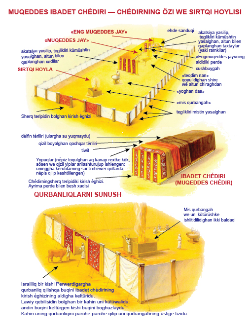 □ 14 Buningdin bashqa, chédirgha qizil boyalghan qochqar térisidin yopuq yasap yapqin, andin uning üstidinmu délfin térisidin yasalghan yene bir yopuqni qaplighin.